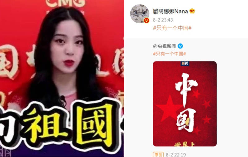 近日美國眾議院議長裴洛西深夜訪台!歐陽娜娜當天晚上就急著在微博轉發「只有一個中國」貼文以表忠誠,消息傳回台灣瞬間在PTT引起熱議、慘遭網友狂酸。(報社合成/翻攝自YT影片、微博 歐陽娜娜Nana)