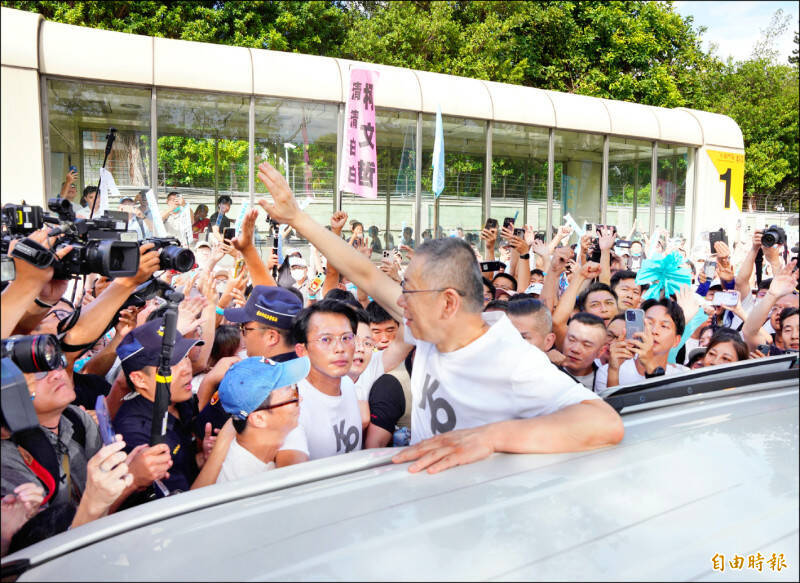 柯文哲步出地檢署,大批支持者在場外聲援,上車前柯與支持者揮手道別。(資料照)