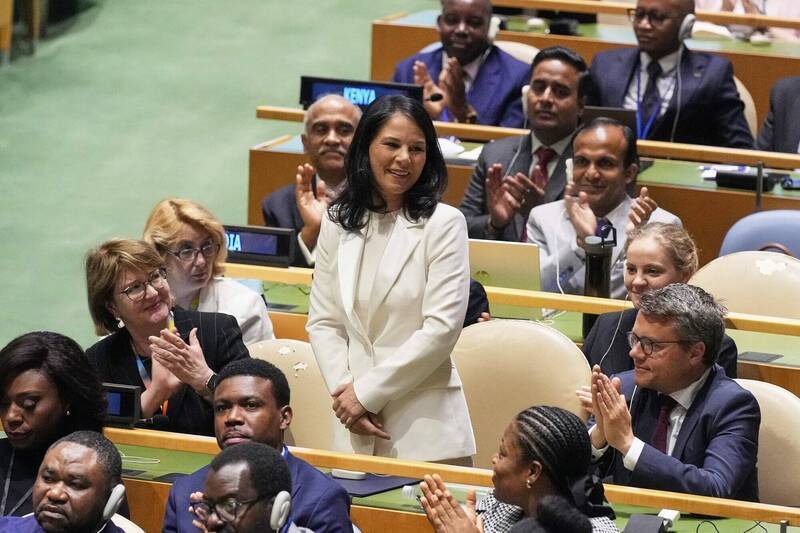 德國前外交部長、聯合國大會主席貝爾伯克(中)支持「一個中國政策」,被強行翻譯成「一個中國原則」。(美聯社檔案照)
