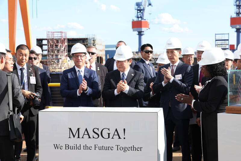 中國商務部於10月14日宣布,對南韓韓華海洋株式會社5家美國子公司採取反制措施,圖為韓國總統李在明今年8月參觀位於費城韓造船廠時鼓掌致意。(歐新社檔案照)