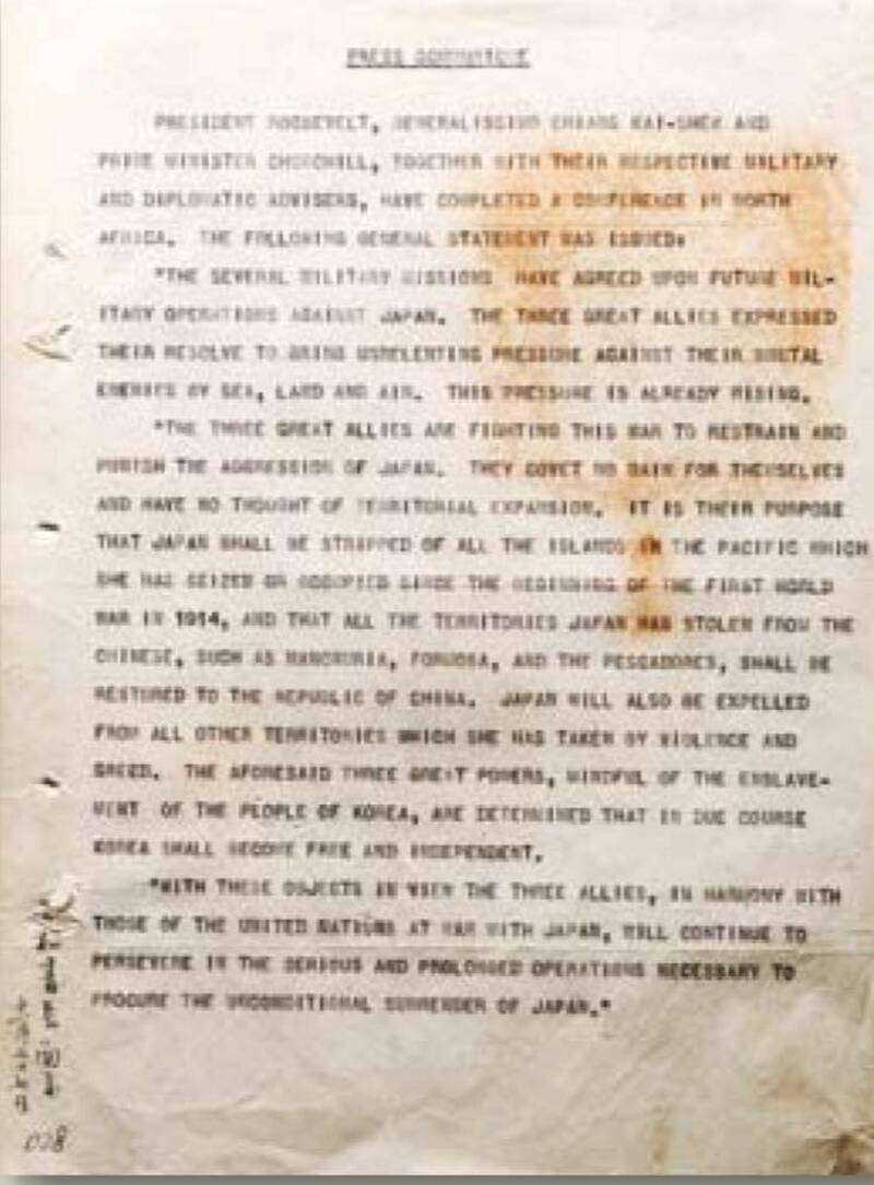 開羅宣言並未決定台灣最終的政治地位,上面寫「新聞稿」,下面沒任何人簽名。圖為宣言正本。(取自網路)開羅宣言並未決定台灣最終的政治地位,上面寫「新聞稿」,下面沒任何人簽名。圖為宣言正本。(取自網路)