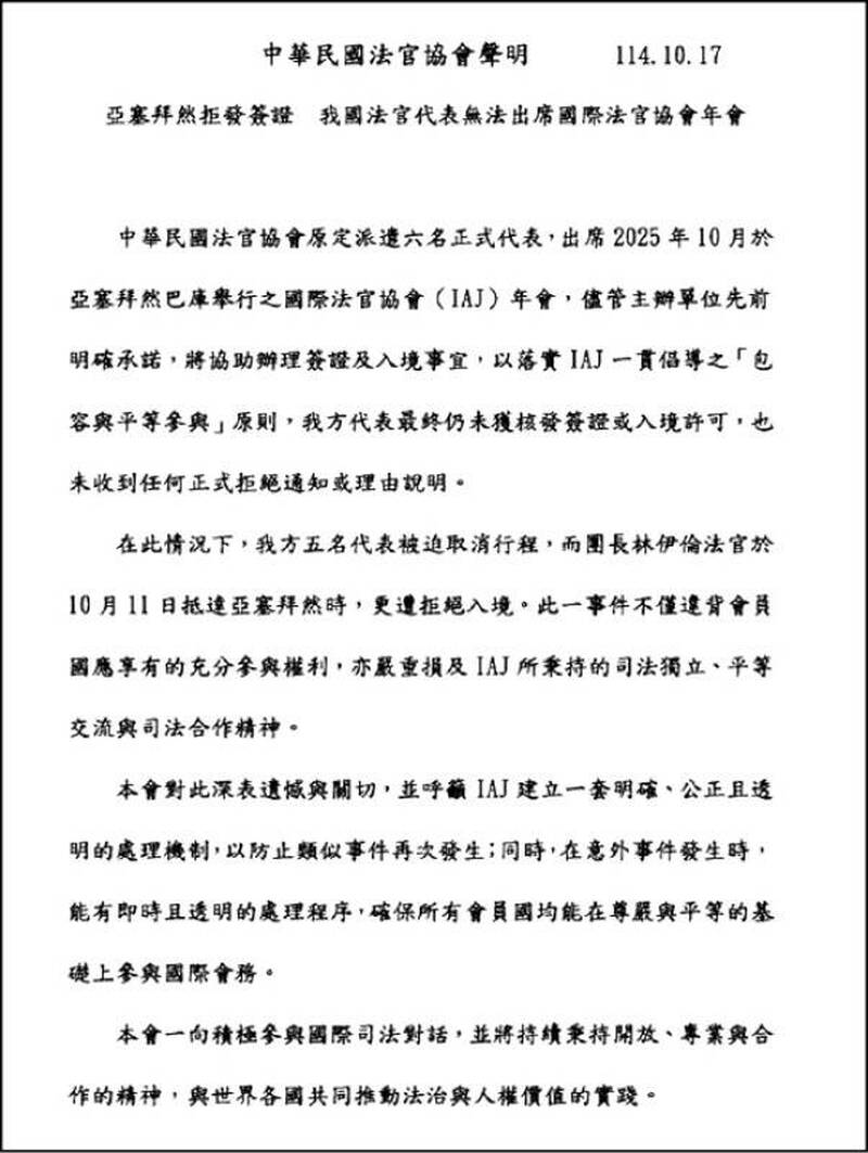 台灣法官協會代表赴亞塞拜然參加國際法官協會年會遭拒絕入境,顯示中共對全球法治空間的滲透與控制。當司法對話平台被政治操弄,受損的不只是台灣,更是全體民主法治國家的尊嚴。