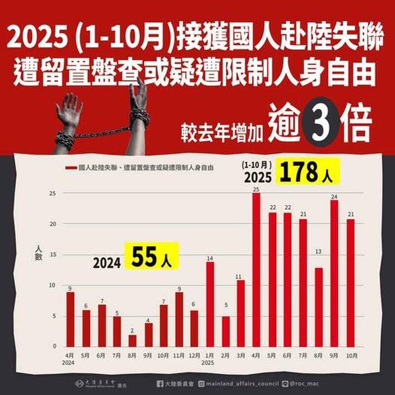 2025年前十個月已有178名台灣人赴陸後失聯、遭留置盤查或疑遭限制人身自由,較去年同期暴增三倍。(擷取自陸委會臉書)