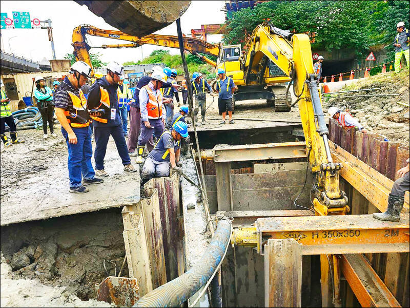 淡北道路日前施工挖破地下自來水管線,造成淡水區6萬多戶停水多日。圖為相關單位搶修情形。(工務局提供)
