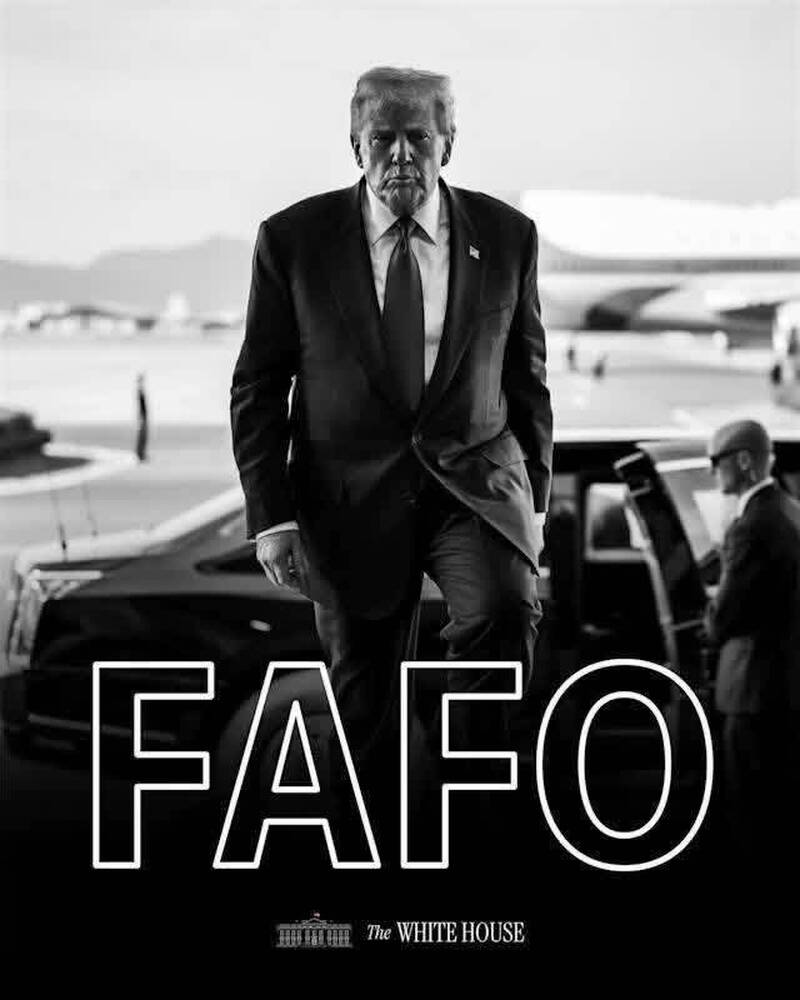 白宮在X平台上貼出一張川普照片,並寫上「遊戲結束,FAFO」,被發現川普這張照片背景是2025年10月的川習會現場。(取自貼文)
