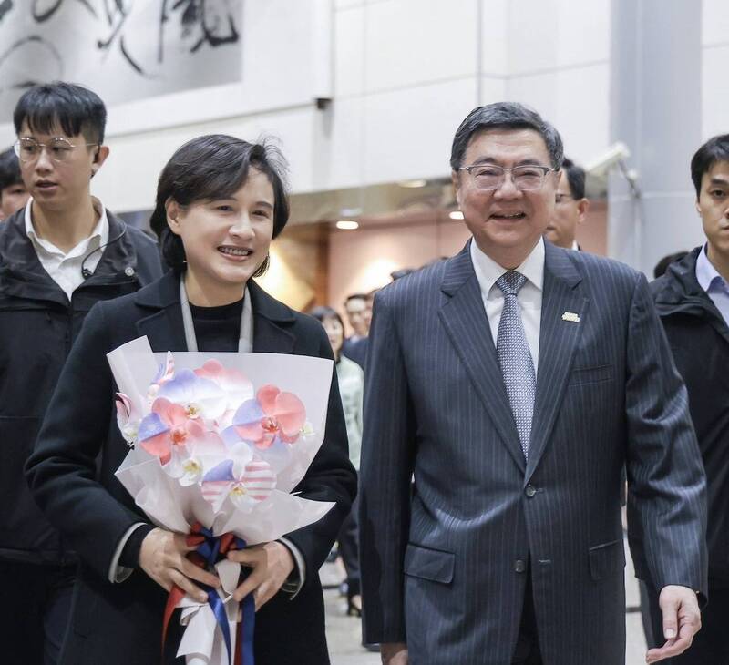 行政院副院長鄭麗君(左)率團隊赴美達成台美關稅談判多項目標後返台,行政院長卓榮泰(右)前往接機。(取自貼文)