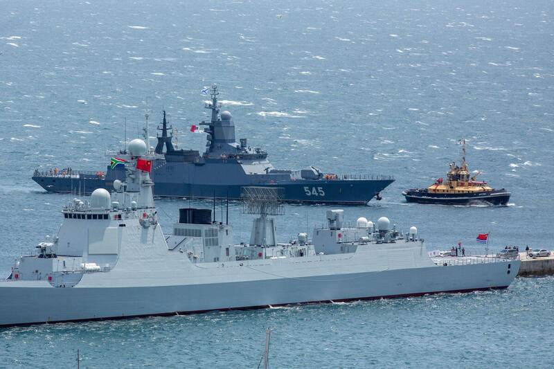 由中國牽頭、多個金磚成員國參與的「和平意志-2026」海上聯合演習開幕式,日前在南非開普敦賽門鎮附近海空域舉行。(彭博檔案照)值得注意的是,這場演習延續了解放軍近年一貫手法,將原本以反海盜、護航為名的遠洋部署,轉化為地緣政治影響力投射工具。無論是派遣052DL型飛彈驅逐艦與補給艦南下,或是結合俄羅斯、伊朗等高度對抗西方制裁體系的國家,中國都在測試跨區域聯合行動的可行性與互通性。這種模式並非正式軍事同盟,卻具備實質協調效果,能在政治成本相對較低的情況下,累積聯合作戰經驗,並向外界展示其「全球性力量」定位。對部分參與國而言,這也是在美歐壓力下,尋求替代安全夥伴的現實選擇,使演習成為一場各取所需的戰略交易。