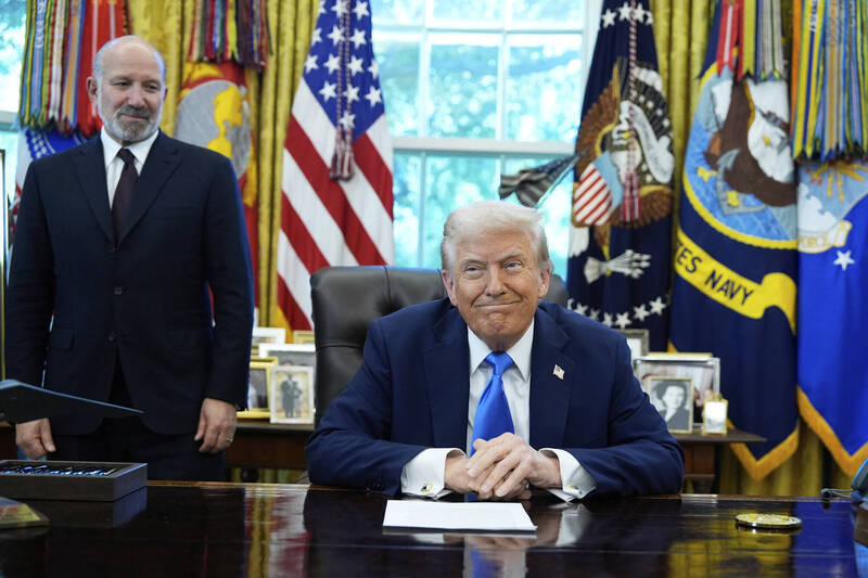 川普總統(右)要求製造業回美國,商務部長盧特尼克(左)說生產半導體的公司不在美生產,要支付100%的關稅。(美聯社檔案照)李在明說「半導體市場中,韓國與台灣合計占有80~90%的市占率,如果真的課徵100%關稅,結果將是美國的半導體價格上漲100%」。