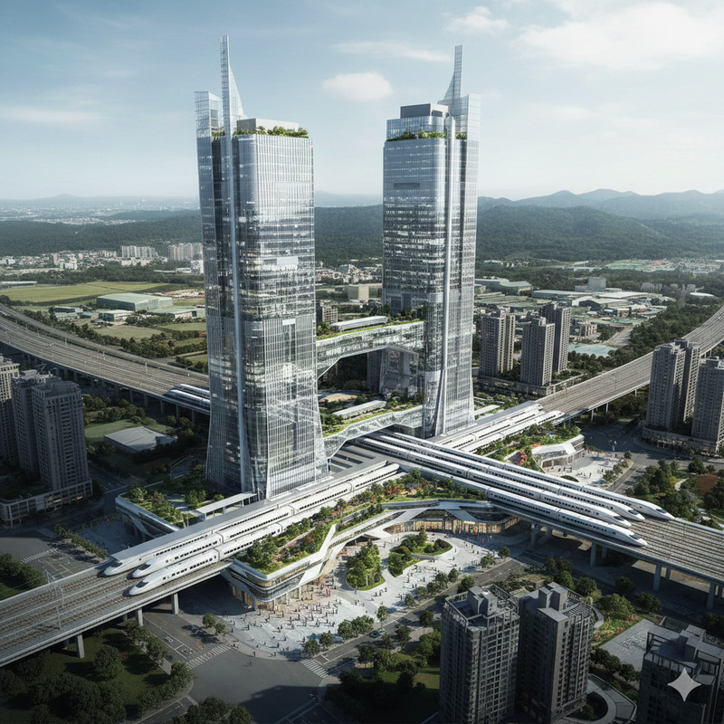 北台第二高鐵經費是透過容積特許權取得,興建「垂直科技城」,供企業進駐。AI製作模擬圖。(作者提供)我們在桃園、新竹、新北的關鍵站點,釋出1200%的超高容積率。這不是隨意給予,而是將其視為一種「虛擬貨幣」或「容積銀行」。政府以「容積」作為入股資本,吸引銀行信貸與8大科技巨頭投資。因為有了高密度開發的特許空間,這些土地的擔保價值瞬間翻倍,開發商與企業更有動力全額出資興建高鐵站體與軌道,政府達成「零預算支出」的可能性。