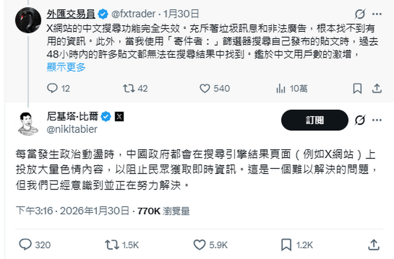 社群平台X的產品主管Nikita Bier曾在用戶貼文底下留言指出,每當中國出現政治動盪,相關關鍵字的搜尋結果往往會被大量色情與伴遊廣告佔據。(擷取自X)近來中國政治情勢再度引發關注。社群平台X的產品主管Nikita Bier曾在用戶貼文底下留言指出,每當中國出現政治動盪,相關關鍵字的搜尋結果往往會被大量色情與伴遊廣告佔據,使真正的新聞資訊難以被找到。