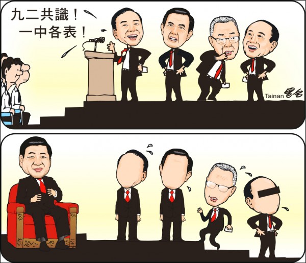 習大大糾正國民黨,說沒有一中各表,只有一國兩制。「九二共識,一中各表」謊言正式破功,四大天王變成「無臉男」!