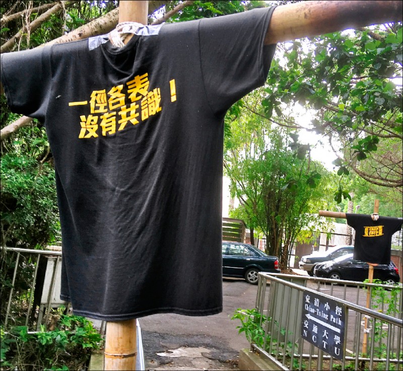 清華大學與交通大學兩校間有條聯通小徑,清華人稱清交小徑,交大人叫交清小徑,選前被掛上黑底黃字T恤,上頭寫著「一徑各表,沒有共識!」諷刺意味濃厚(見圖)。