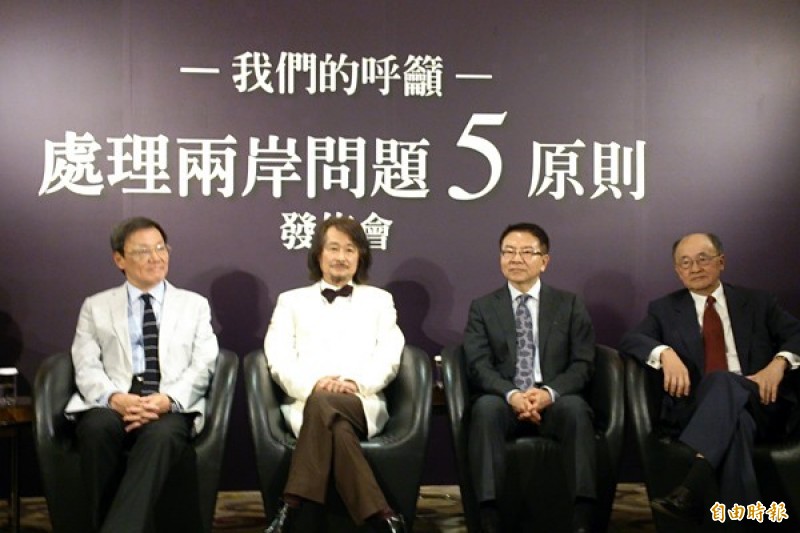 洪奇昌(右二)多次對兩岸議題表示審慎樂觀的態度,圖為去年5月洪奇昌參與「處理兩岸問題五原則」記者會。(資料照,記者陳慧萍攝)
